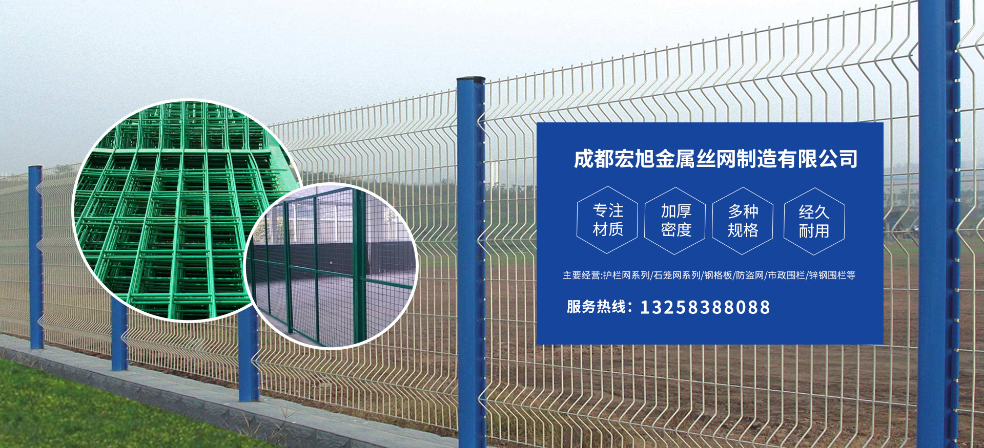 成都宏旭金屬絲網(wǎng)制造有限公司主營(yíng)護(hù)欄網(wǎng)系列、石籠網(wǎng)系列、鋼格板、防盜網(wǎng)、市政圍欄、鋅鋼圍欄、鋼筋網(wǎng)片、聲屏障系列、波形護(hù)欄板、柔性纜索護(hù)欄、SNS邊坡防護(hù)網(wǎng)等其他絲網(wǎng)類產(chǎn)品。特殊規(guī)格可加工定做,也可根據(jù)客戶來(lái)圖來(lái)樣定做。自創(chuàng)業(yè)以來(lái),公司一直堅(jiān)持市場(chǎng)為導(dǎo)向,以客戶為根本,以實(shí)業(yè)為基礎(chǔ),以技術(shù)為支持,以科研為后盾,集科研、生產(chǎn)、經(jīng)營(yíng)為一體,不斷研制開發(fā)新產(chǎn)品,開拓市場(chǎng),走綜合發(fā)展之路。多年來(lái),公司憑借過硬的質(zhì)量,良好的信譽(yù)、優(yōu)質(zhì)的服務(wù)、合理的價(jià)格,贏得了市場(chǎng)和商家的一致好評(píng)。